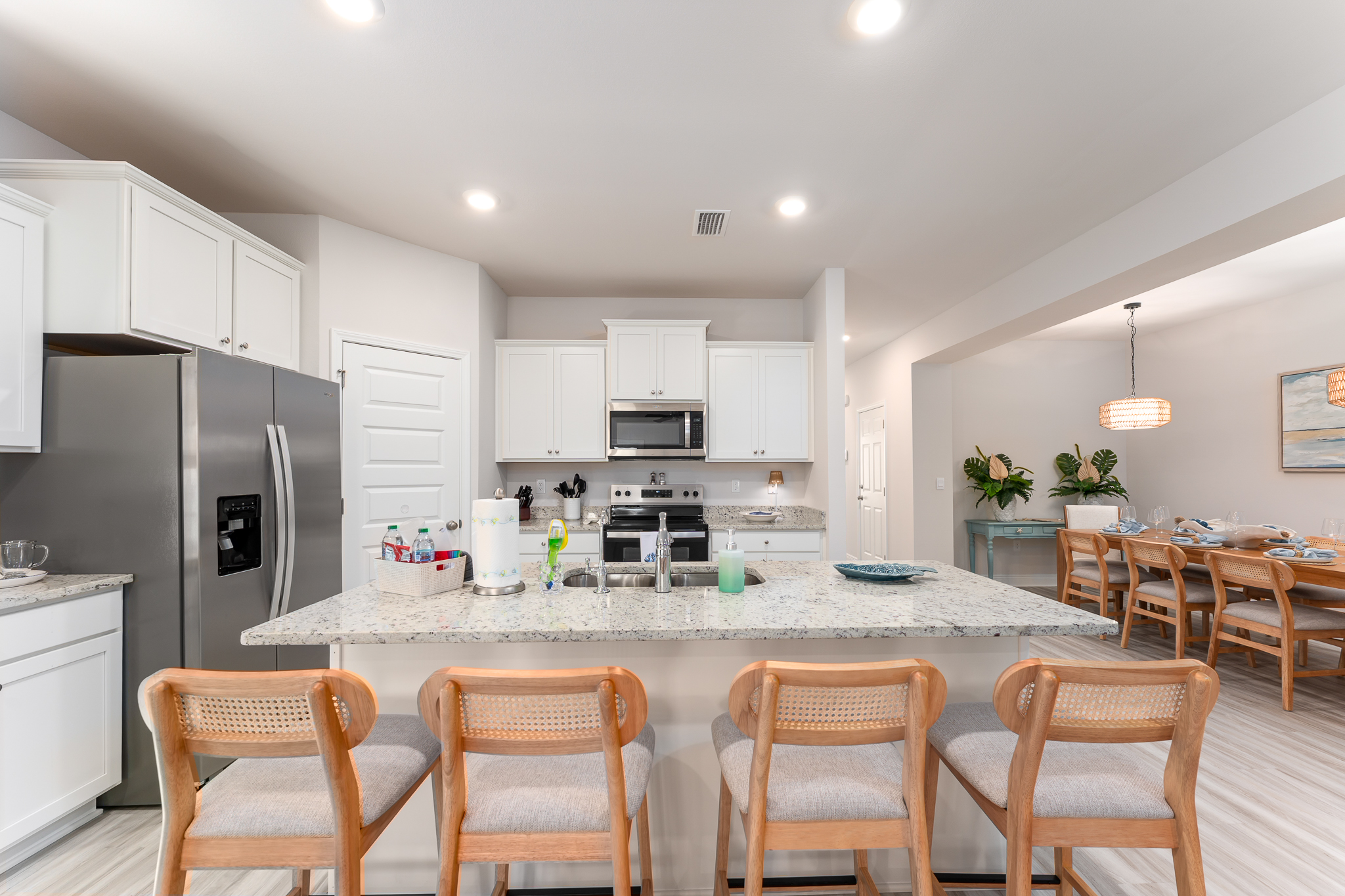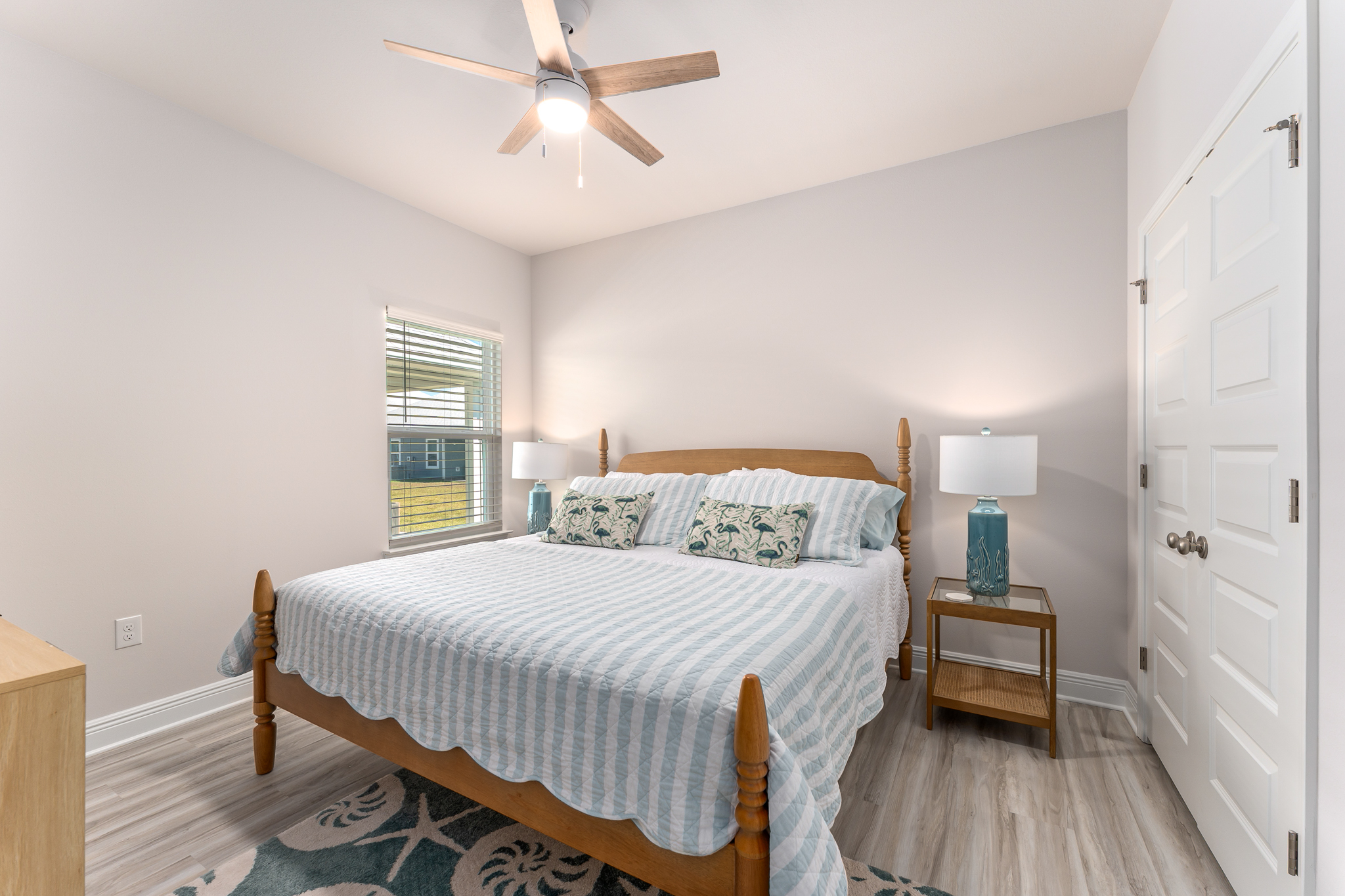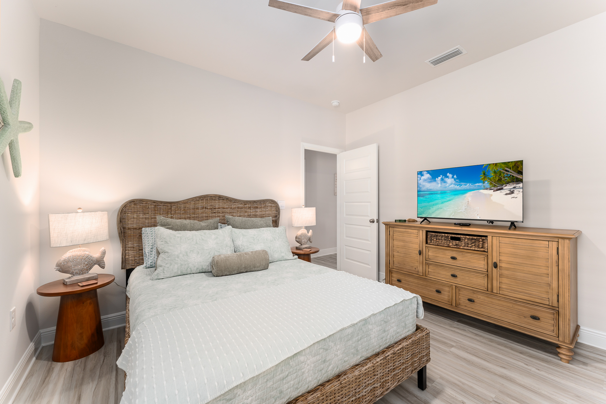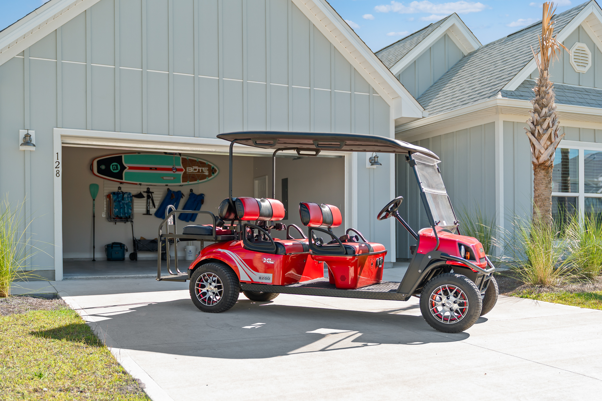 A 6-seater golf cart for cruising around the community, a paddleboard for water adventures, and a screened-in porch with outdoor seating make this spot perfect for relaxation. It comes equipped with beach towels, chairs, a wagon, an outdoor shower for rinsing off after sandy outings, and a cornhole game for some outdoor fun. Enjoy fast Wi-Fi, a washer/dryer, smart TVs throughout, and exterior audio/video security (with no devices inside). Family-friendly extras and all your essential beach gear are included for a hassle-free getaway.